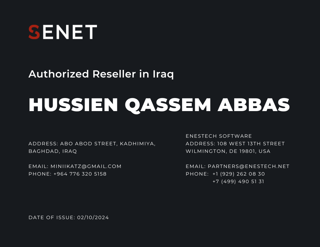 Enestech Software has a global network of local partners that understand your unique business and industry needs. The certificate below confirms that Hussien Qassem Abbas was authorized to be our sales representative and technical support for Iraq customers. Thereby our clients receive high-quality service in local language and time zone.